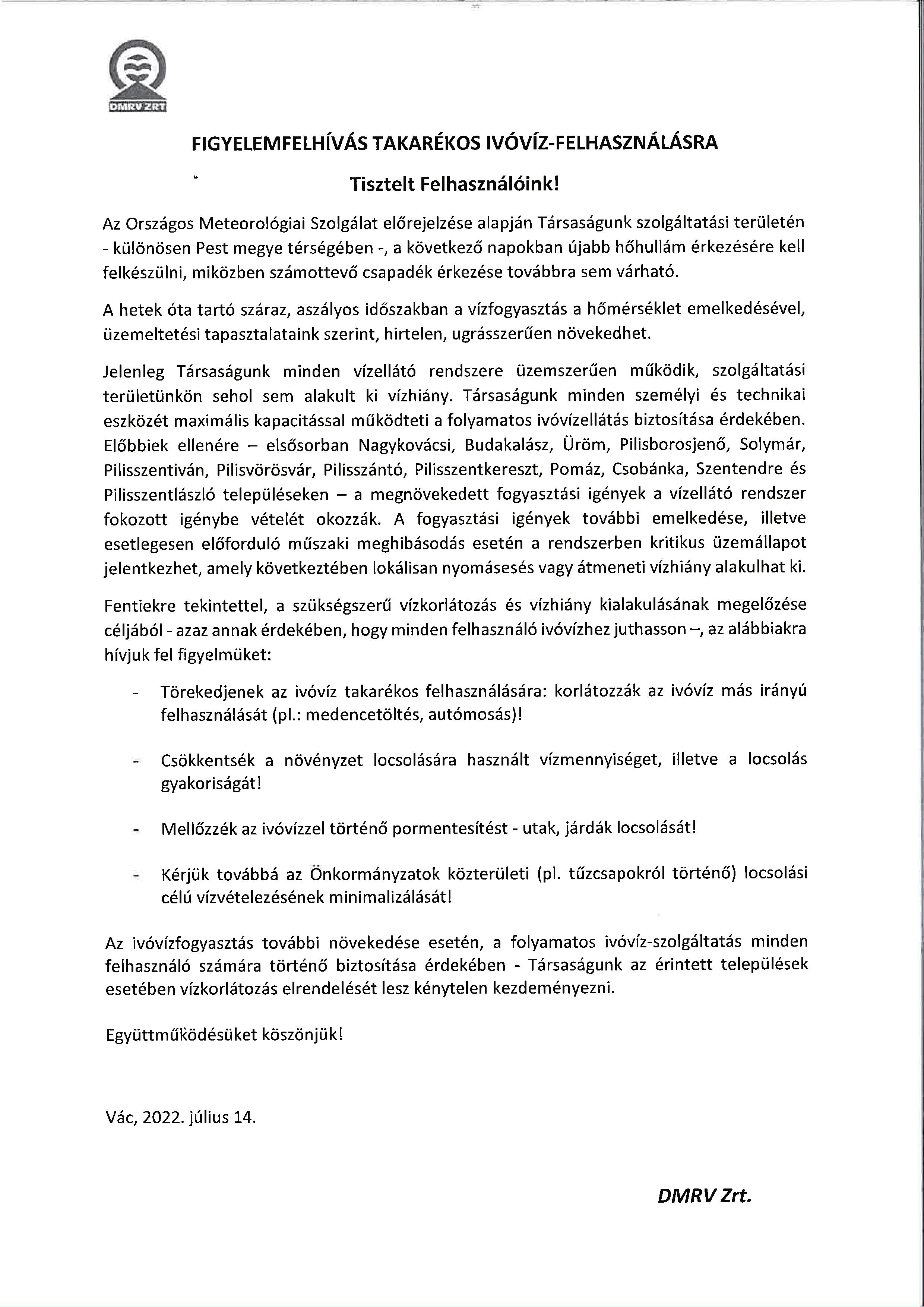 Lakossági tájékoztató HŐSÉGRIADÓ idejére