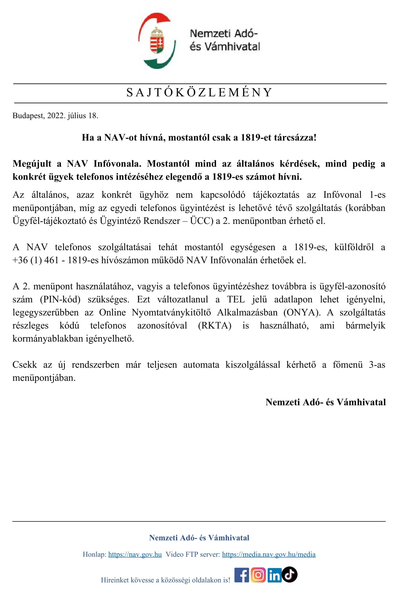 NAV sajtóközlemény - hívószám