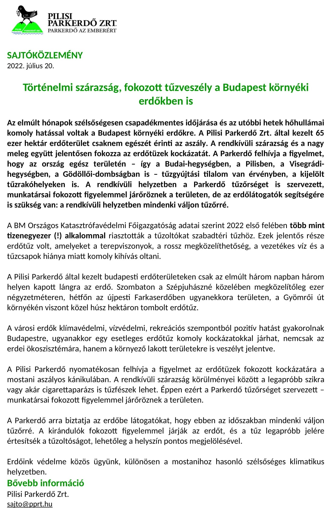 Pilisi Parkerdő Zrt. - Sajtóközlemény